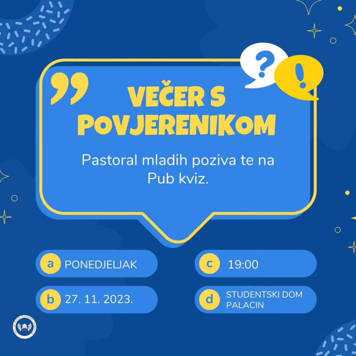 Dragi studenti i mladi 27. studenog 2023. u 19:00 pozivamo vas na VEČER S POVJERENIKOM u studentskom domu Palacin. Večeri su to zajedništva, upoznavanja i druženja.