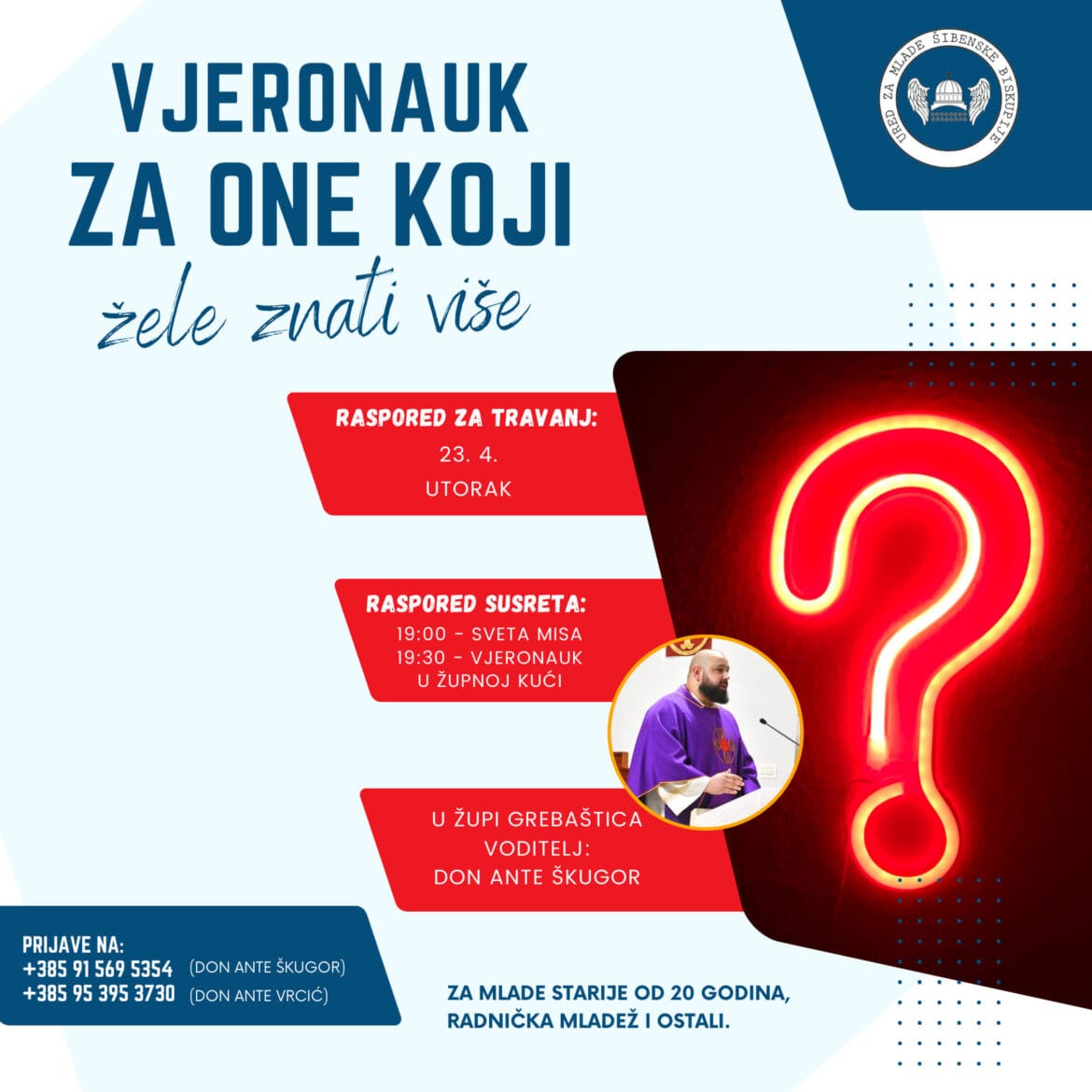 Želite li znati više o vjeri? Imamo sjajnu priliku za vas! Don Ante Škugor vas poziva na vjeronauk koji će se održati u župnoj kući u Grebaštici.